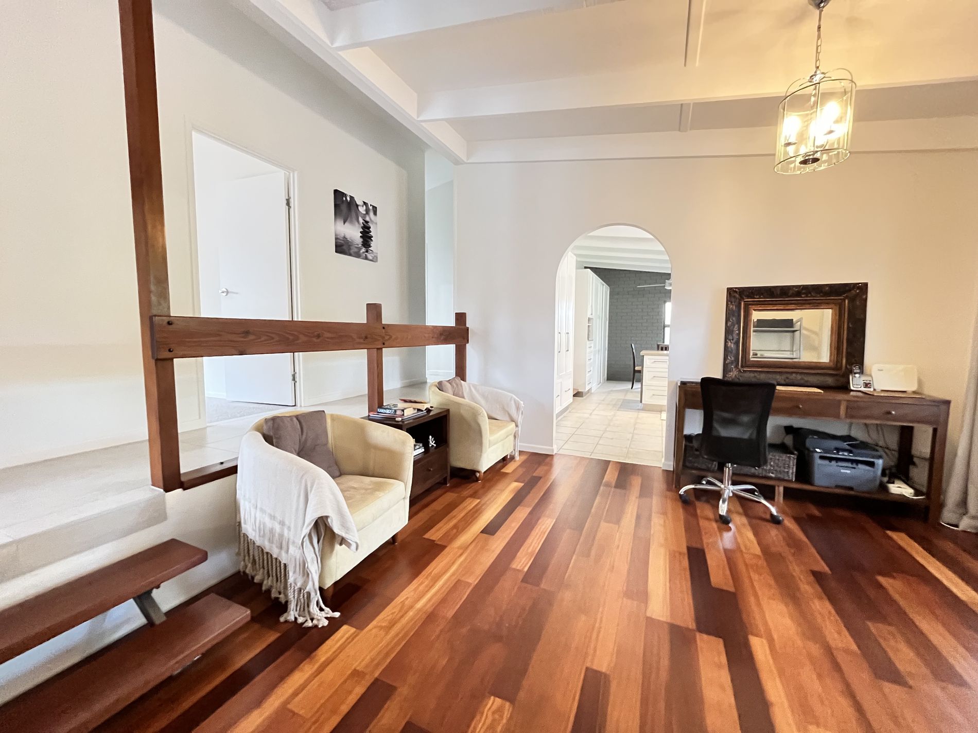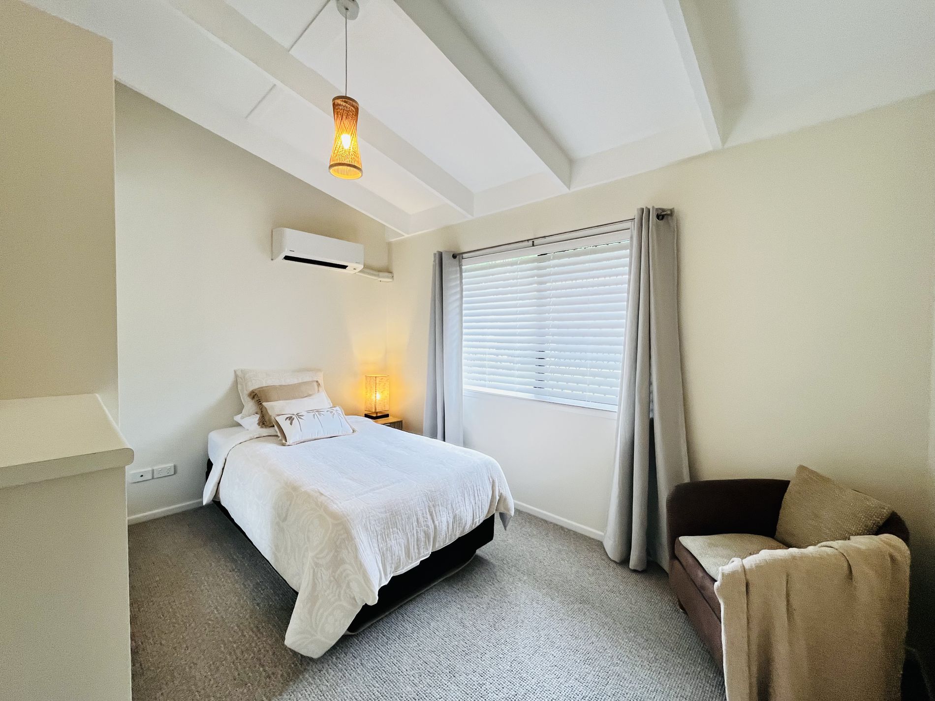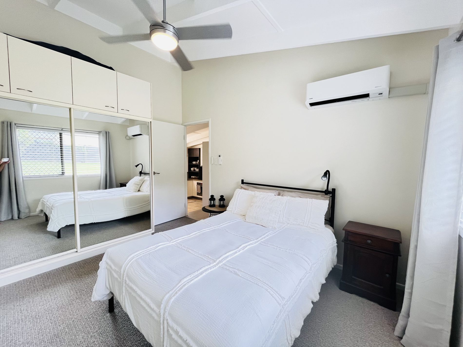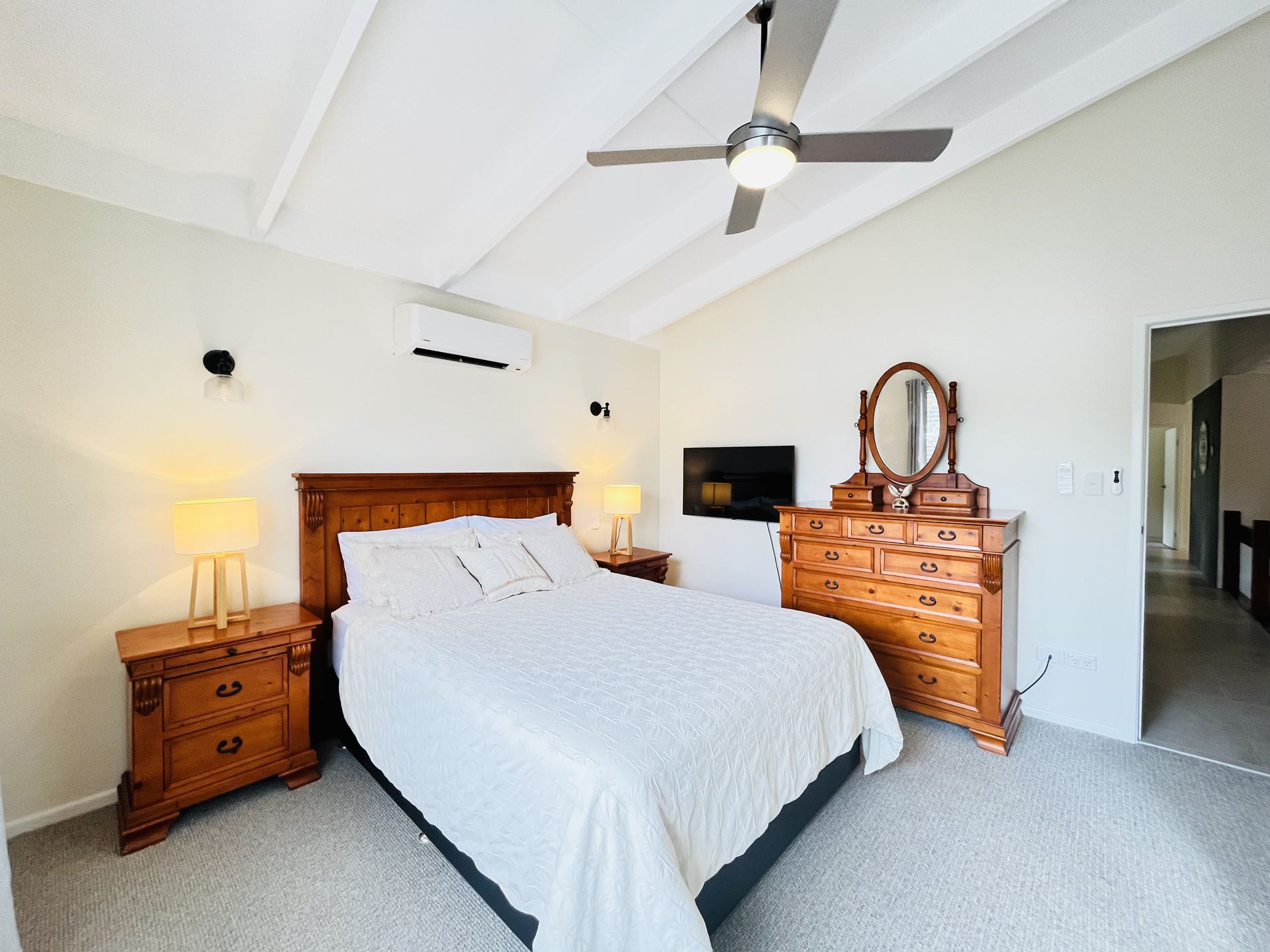 The main residence features three spacious bedrooms and a modern bathroom, complemented by high raked ceilings and two separate living areas that create a light-filled, welcoming atmosphere. The renovated kitchen, bathroom, and laundry showcase a very stylish design, offering contemporary finishes while maintaining timeless appeal. Built-in robes, air-conditioning, and ceiling fans throughout ensure year-round comfort.