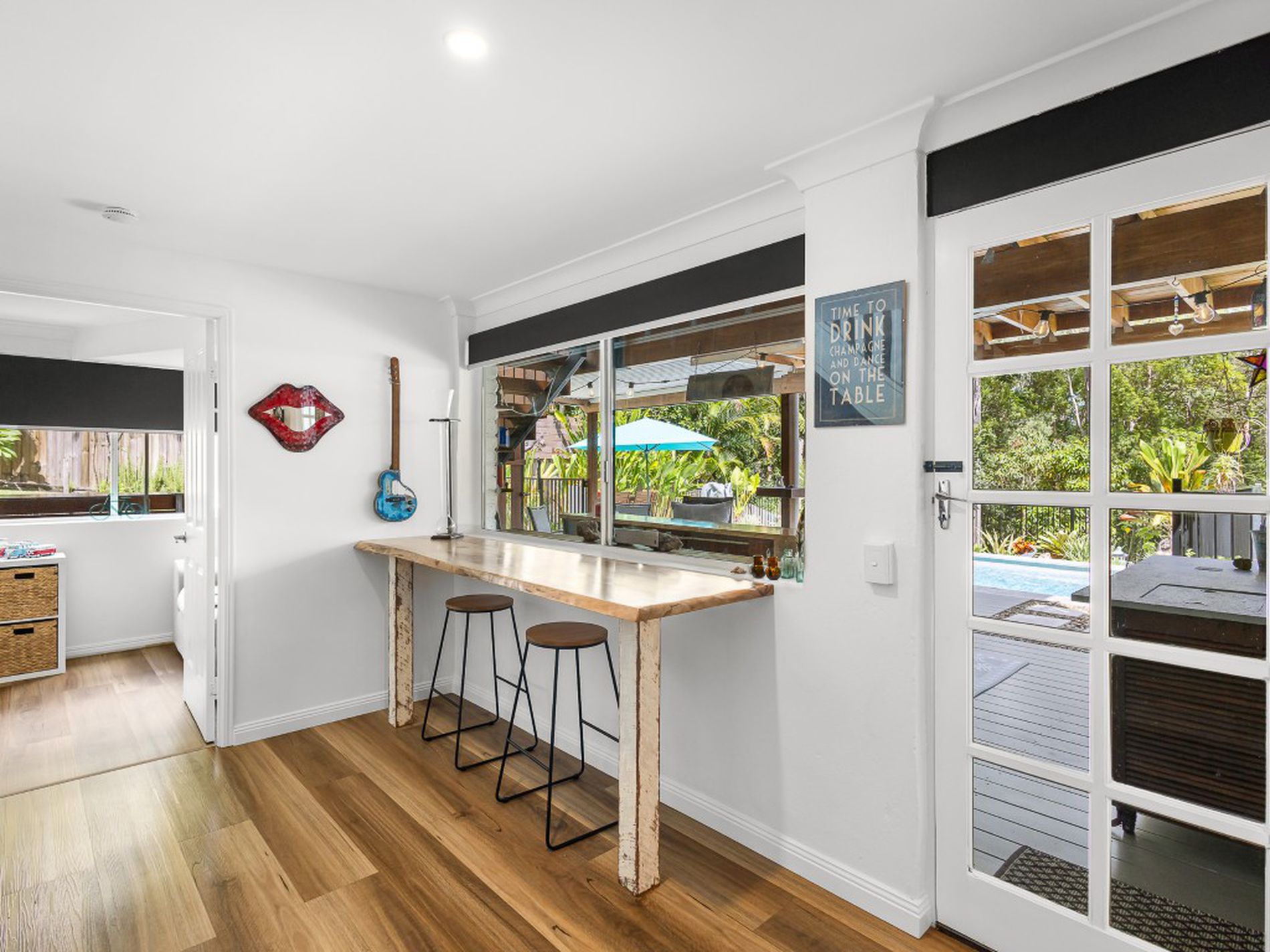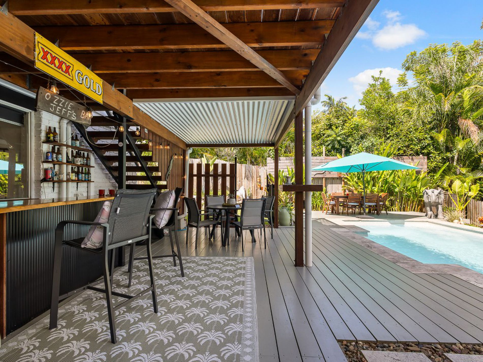 Outdoor living unfolds effortlessly. An expansive deck extends from the dining room at treetop level, capturing cooling breezes and elevated views. Below, the poolside entertaining area and bar create a relaxed setting alongside the large in-ground swimming pool.