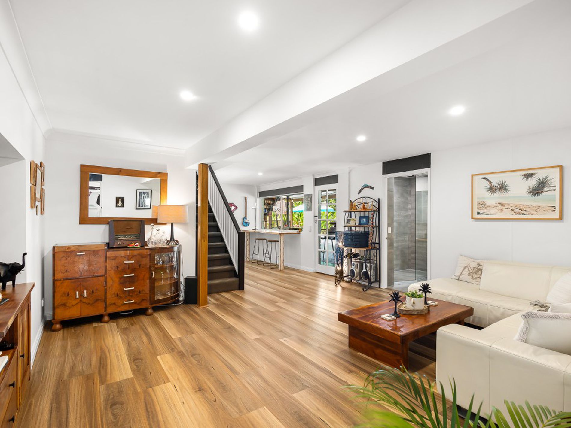 Downstairs offers a thoughtfully designed guest retreat, complete with its own living area, spacious bedroom, walk-in robe, air conditioning and mini-bar – with internal access and a private access, It’s an inviting extension of the home, equally suited to extended family or long-term guests.